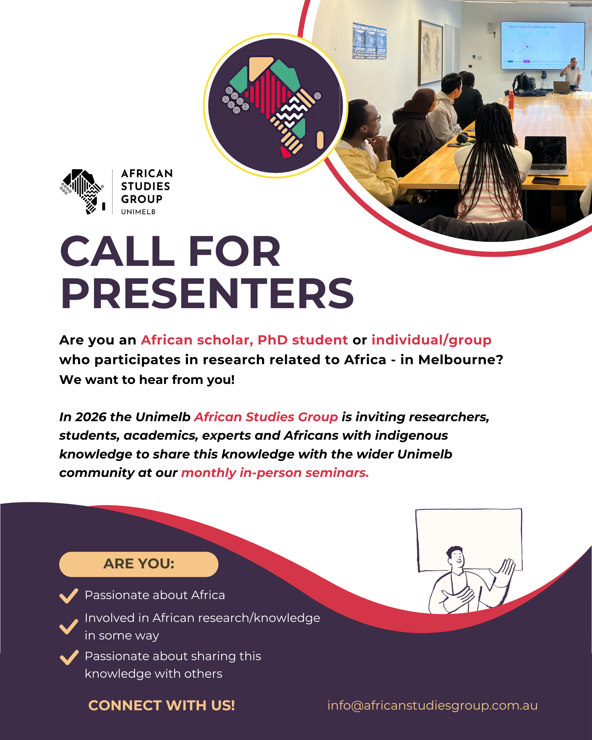 Below are links to our open calls for presenters, article subission and other current opportunities. If you have any inquiries feel free to email us at info@africanstudiesgroup.com.au